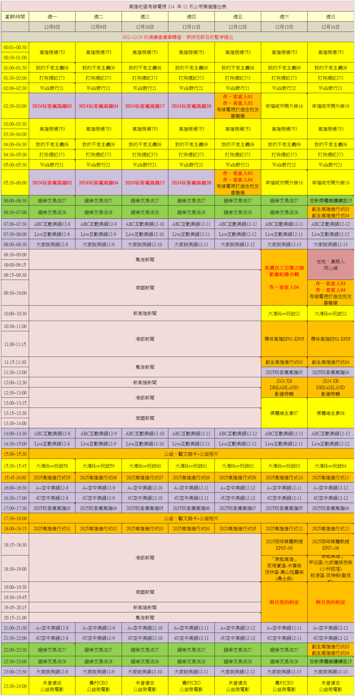 | 06:00-07:00 | 南國心高雄情(重播)(普) |