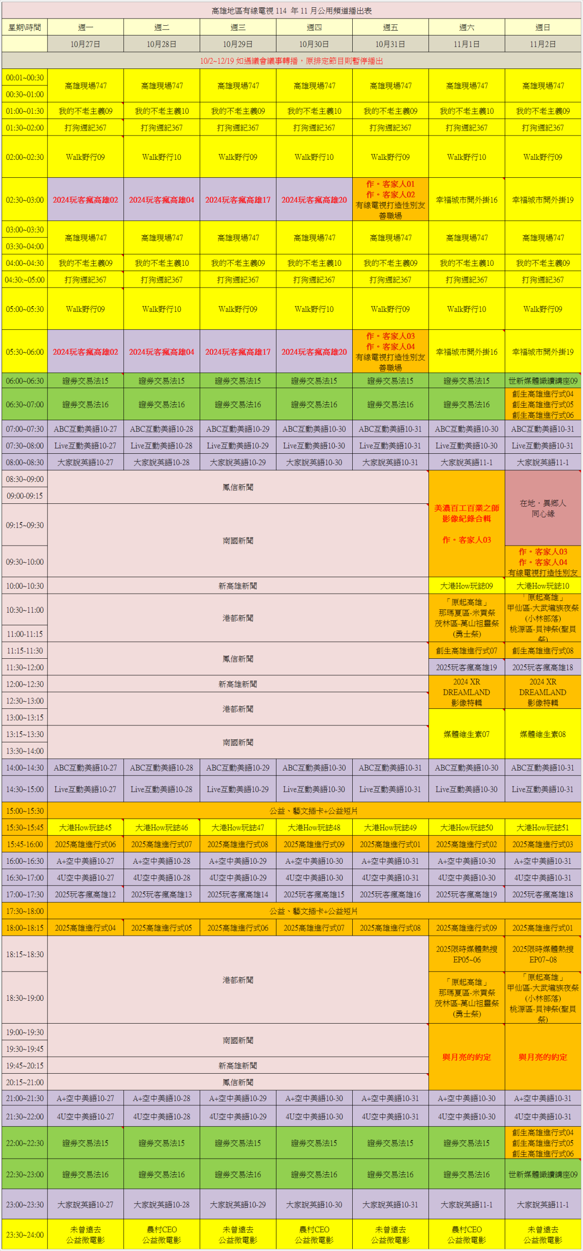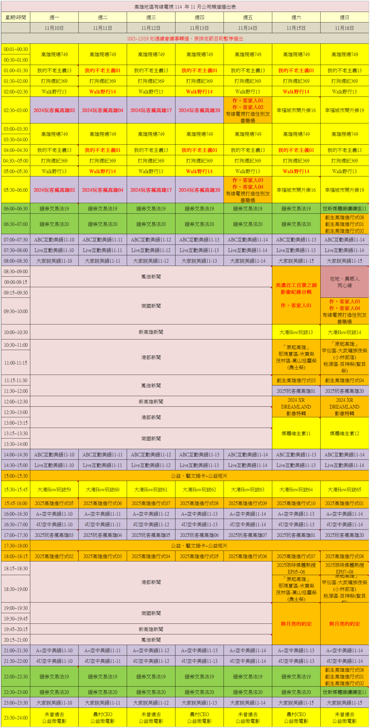頻道表/公用頻道節目表/自製頻道節目表